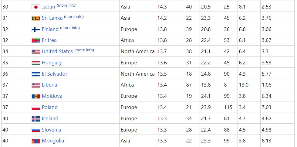 しかし中央値にするとアメリカランク外、日本6位浮上