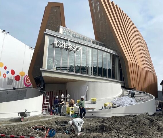 竹中工務店、清水建設など大手ゼネコンによる共同企業体が建設。開幕前に完成したものの、盛り土が