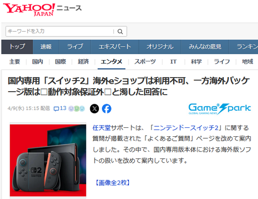 国内専用Switch2 海外eショップ利用不可