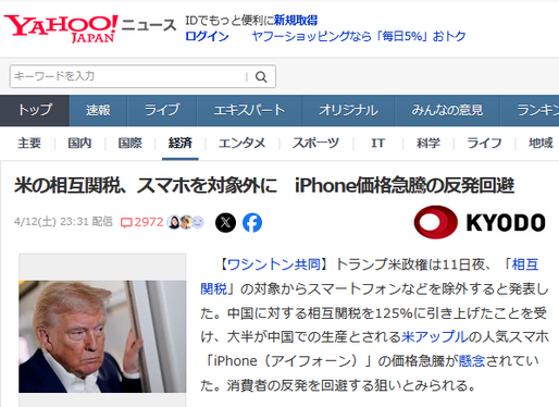 トランプ米政権は11日夜、「相互関税」の対象からスマートフォンなどを