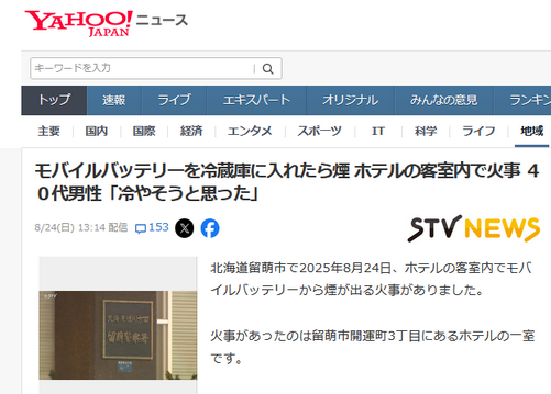 モバイルバッテリーが発熱し、冷やすために客室内の冷蔵庫に入れると