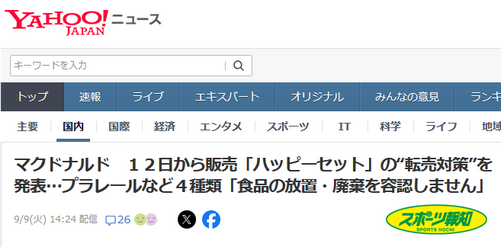 「マクドナルドは、食品の放置・廃棄を容認しません。ハッピーセットの転売目的での購入や再販売、