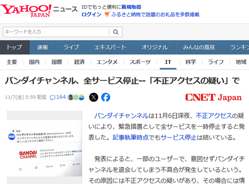 バンダイチャンネルは11月6日深夜、不正アクセスの疑いにより、