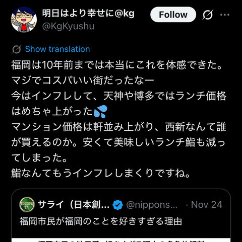 そもそも福岡がコスパ良いなんて聞いたことねーよ