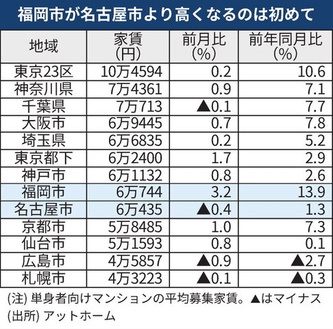 家賃、最高値更新 福岡が初の名古屋超え