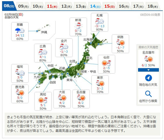 日本付近は8日午前、強い冬型の気圧配置となった。北日本から西日本にかけての日本海側で大雪となったほか、太平洋側でも大雪となっている所がある。上空に一層強い寒気が流れ込み、大気の状態が非常に不安定となる見込みで、気象庁は大雪や暴風雪による交通障害、高波に警戒するよう呼びかけた。